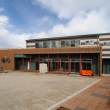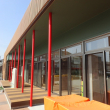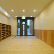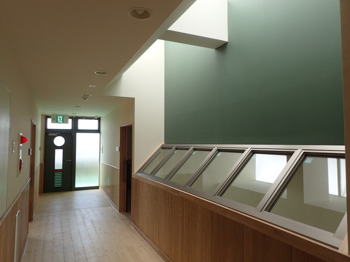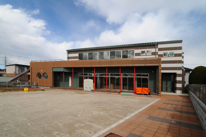 ■無機質になりがちな外壁に木質系のルーバーを配置し柔らかな感じとルーバーの陰による熱のコントロールを行っています。園庭土間はとても水はけが良く雨の後も水溜りが発生しません。全館を通し「いちご」をイメージさせるクラシックグリーンとアクセントのレッドがメインカラーとなっています。