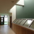 ■メインの玄関です、下足箱上部から間接自然光を穏やかに取り込んでいます。玄関扉は天井いっぱい2.7mスロウクローズのスチール製引き戸。テーマカラー、クラシックグリーンと赤のアクセントワンポイント