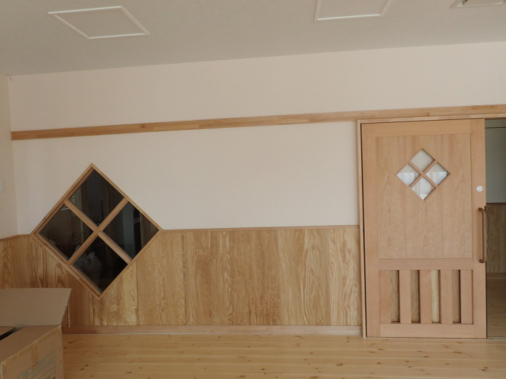 ■床:無垢赤松縁甲板張自然塗料塗布、床下には体に優しい水循環型床暖房で穏やかに温めてくれます。壁天井は珪藻土クロス貼りで少しでも調湿、調臭効果を発揮してくれています。