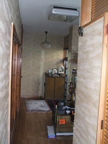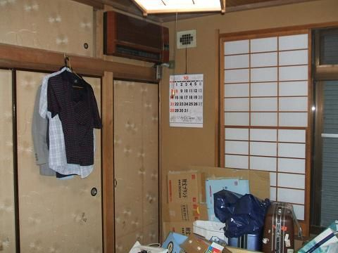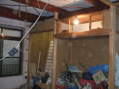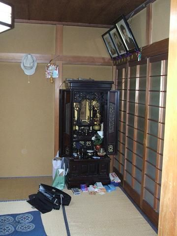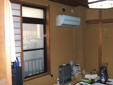 仏壇右手ガラス戸外は玄関、背面の壁裏は2階に上がる直行階段室で従ってこの壁は将来とも撤去できない。エアコンがついている写真は仏壇の反対コーナー柱がついた真壁部分は隣和室6帖との接点になる為撤去して開口部を設ける