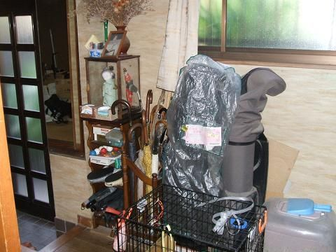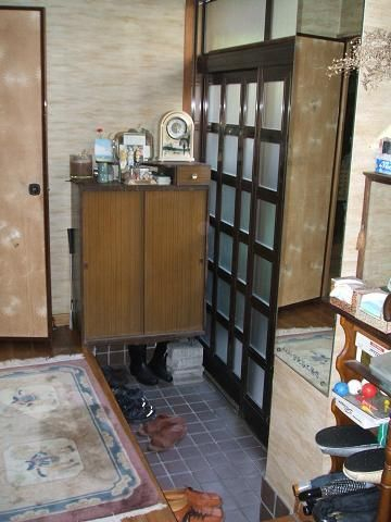 玄関ホールは1間廊下の半分(半間)を利用して設けられています、基本的に外部開口部は現況利用とするため玄関位置は改修後もこのままですが物が表に沢山出ているので収納場所の確保を今回は図ります