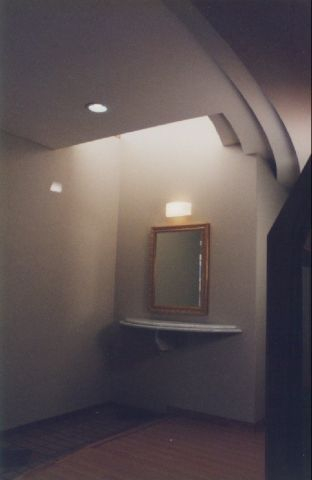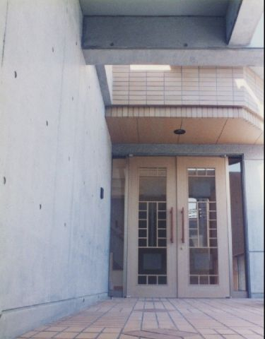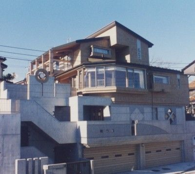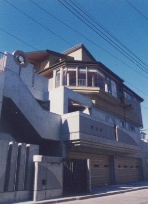 35~40°にもなる急斜地に建てられています、別荘地などではこの程度の斜面は当たり前ですが二世帯住居と言う事も有りさまざまな機能を要求される恒久的な住宅の敷地としては初めての経験になりました。高低差が5~6m有りましたので地下2階道路レベルに駐車場、その上の地下1階レベルに玄関、オーディオルームを配しています、道路からは地上階に見えますがいずれも地下扱いですのでアプローチ、自然光の取り込み方に工夫をしています