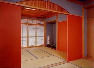 多目的に柔軟に対応可能な二間続きの和室です、外部でも見られる弓型のデザインが天井、欄間などさまざまな部分で用いられています