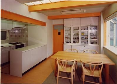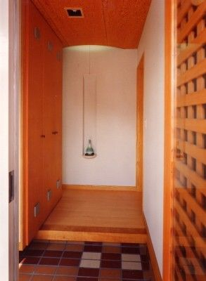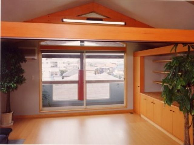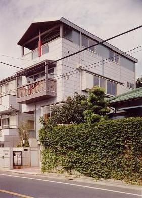 「渡辺篤史の建もの探訪」に取り上げられた建物で、80㎡(24坪)、間口3.2間で奥行きの長敷地に建つ住宅です、道路との高低差130㎝程度有った為少々高めの基礎部分を地下1階駐車場にし1階を鉄骨造、2,3階を木造とした混構造で出来ています、法事等でまとまった人が集まる機会が多いということも有り2階和室は二間続きが条件となった住居でした