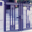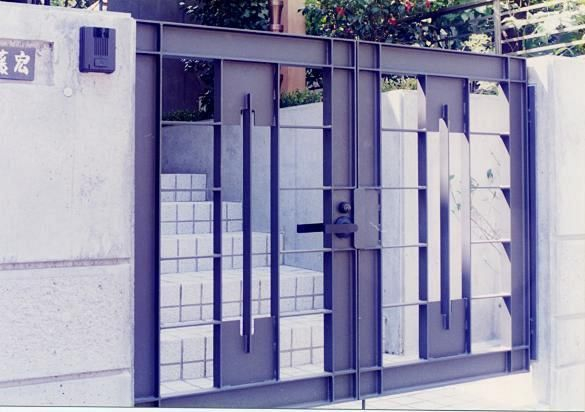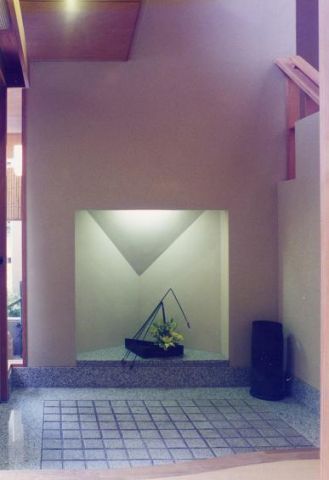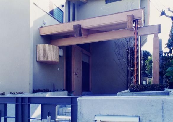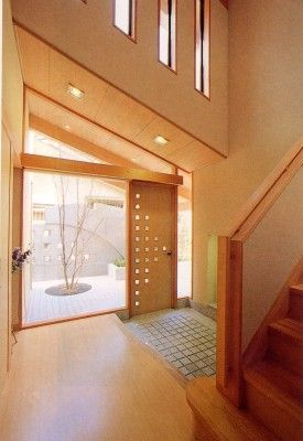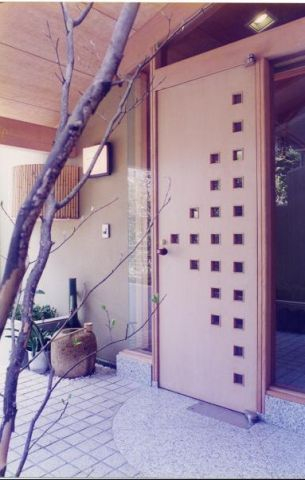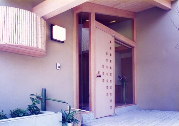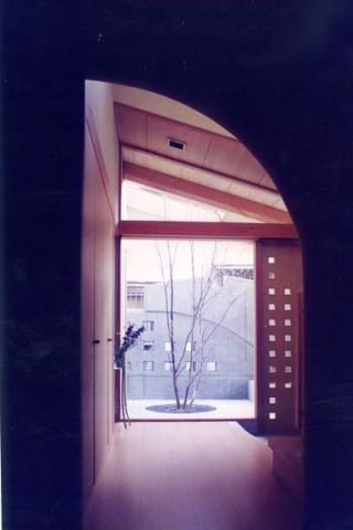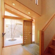 玄関はガラス窓を通し隣家との隔て板、コンクリート打ち放しアイストップを設け坪庭状としてシンボルツリーにシャラ(夏椿)が植えられホットする空間になっています。