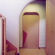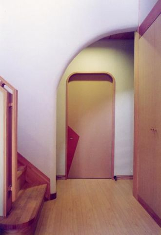 敷地は道路面より80~90㎝上がっており道路は画面右(西)から左(東)に下がっています、この敷地条件を利用して北エリアと南エリアを階段で結ぶスキップ構造とし手前道路側エリアを水周り、寝室を配し、寝室下には地下扱いのオーディオルームが設けられて動線省スペース化が計られています。
