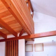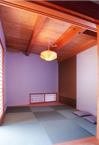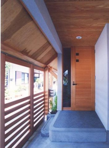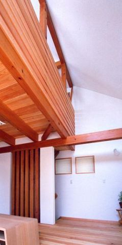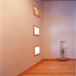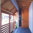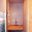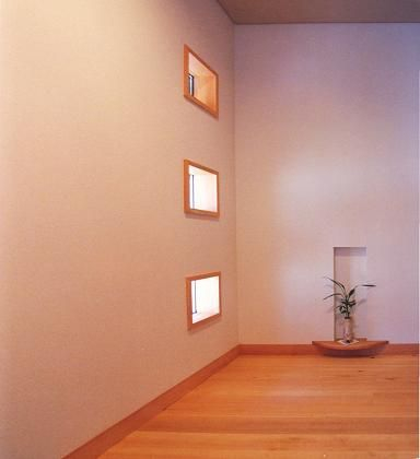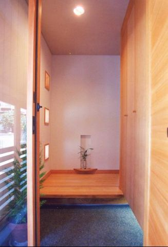 玄関の床は施主思い入れの洗い出しになっています、下足箱は天井までの収容力いっぱいです。正面のニッチはたすきがけ筋交いを避けた部分を利用した小物置き場で空間に潤いを与えています