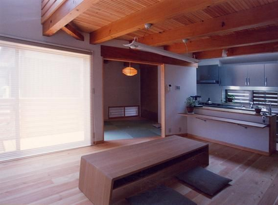 リビング・ダイニング・キッチン 床:欧州赤松、壁:珪藻土、天井:欧州赤松3階床現し、リビングに吹き抜け、北側キッチンにトップライトが仕込まれた吹き抜けを配し採光たっぷりの部屋になっています
