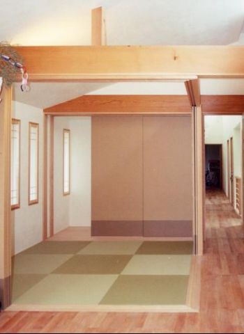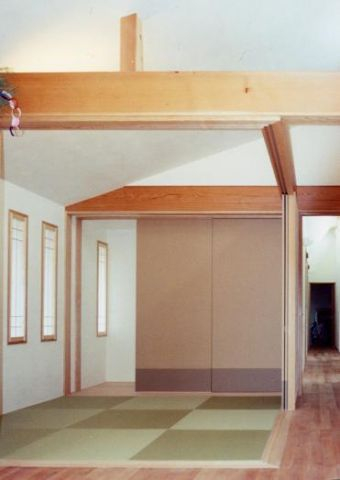メインのリビング・ダイニングです床は桜の縁甲板、壁は漆喰コテ仕上げ、天井は化粧梁現し珪藻土になっており自然素材主体の体にやさしい材料が使用されています