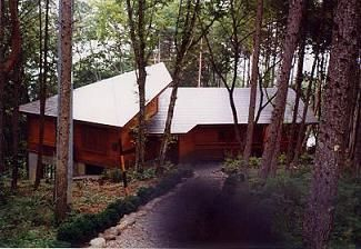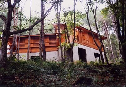 蓼科の別荘分譲地内に当社で設計した建物が10棟ほど在りますがその内の2棟を紹介しています。各々敷地状況、環境にあわせ特徴を持っていますが共通点は環境になじんだ材料、空間構成となっており特に外壁を地場産の唐松を竪横張り分け使用し、建具のクロス格子がアクセントになっています。