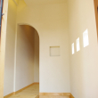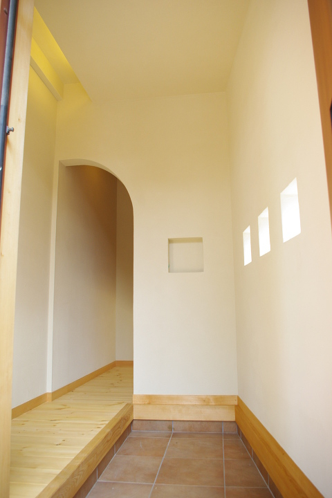 ■ 新築棟 玄関:こじんまりした玄関ですが外塀側に胸の低い位置に設けた真角の飛び窓、関連付けて同じく真角のニッチ、リズミカルさを出し間接照明も相まって変化を与えています。奥はシューズ庫