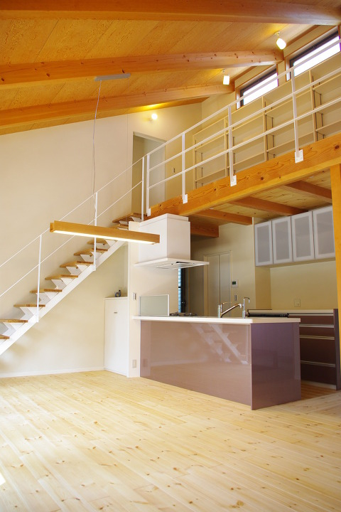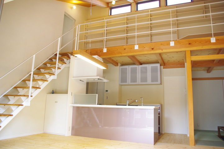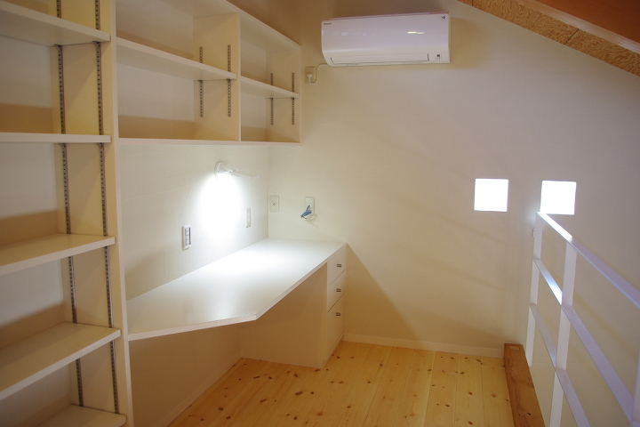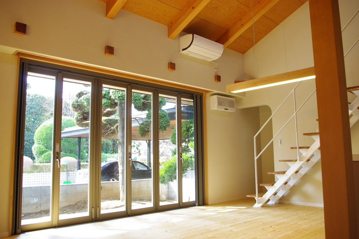 床は水蓄熱床暖房、外周はセルロースファイバー断熱材で覆われており、内部壁は珪藻土塗り壁、木部は全て無垢で自然塗料が施されています。