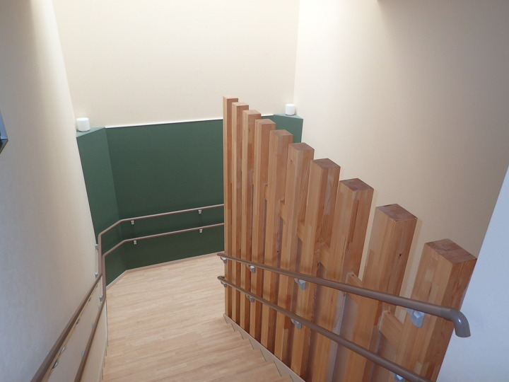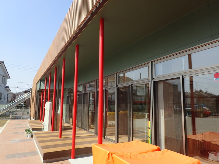 ■無機質になりがちな外壁に木質系のルーバーを配置し柔らかな感じとルーバーの陰による熱のコントロールを行っています。園庭土間はとても水はけが良く雨の後も水溜りが発生しません。全館を通し「いちご」をイメージさせるクラシックグリーンとアクセントのレッドがメインカラーとなっています。