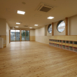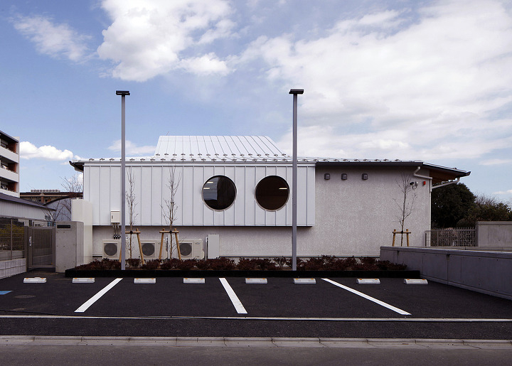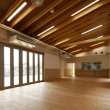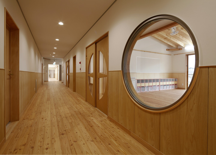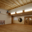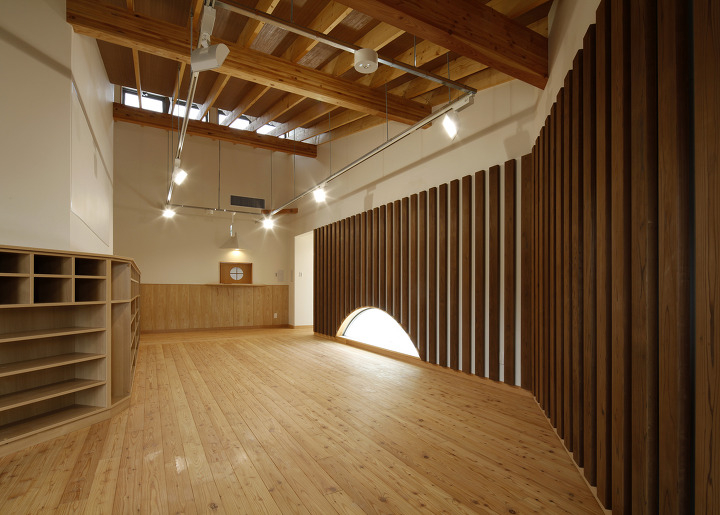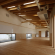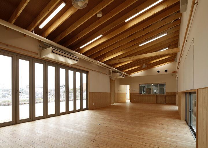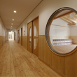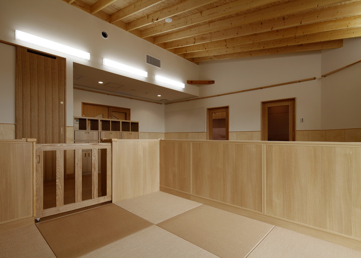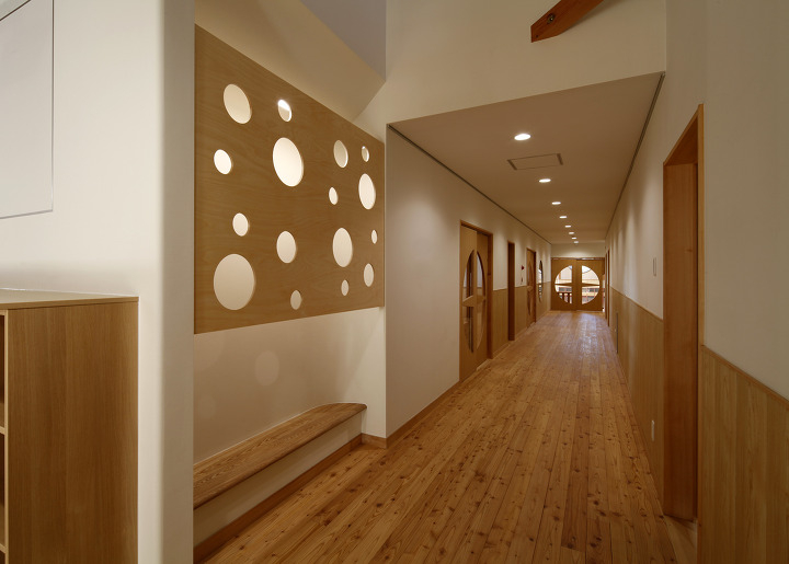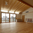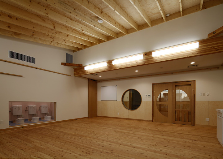■ 保育園は学校と位置付けが異なり建築基準法上一層厳しい制限を受け、延べ床面積が500㎡を超えるとさらにクリアする項目が増え、木造らしさを表現するのに腐心することになるのですが当園では大きな断面の母屋垂木表しや玄関部分に集中的な木の使用、照明BOXなどの小物を有効に使うことにより視覚、触覚、質感など木造らしさを与えています。