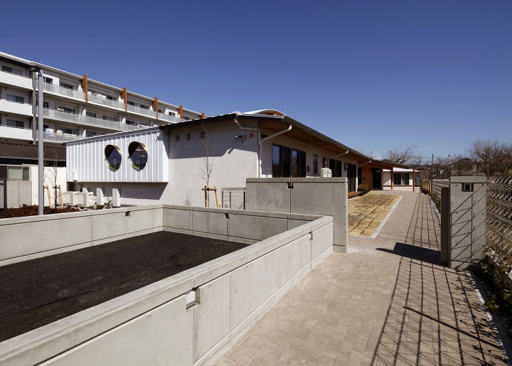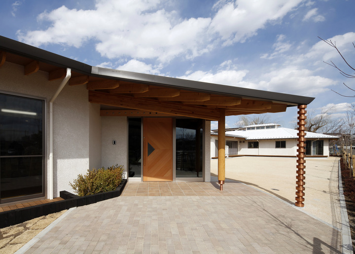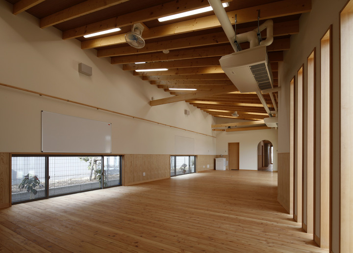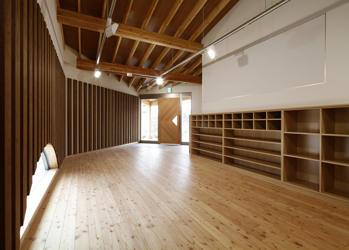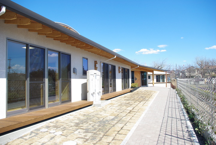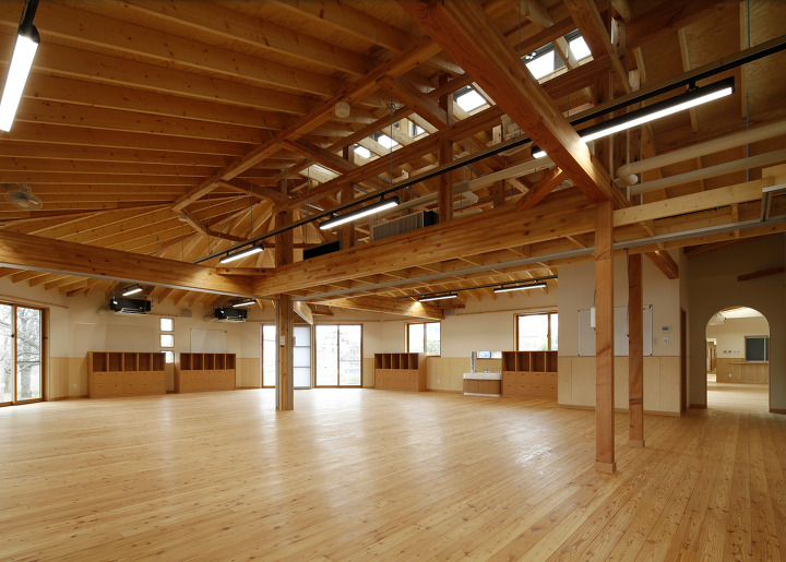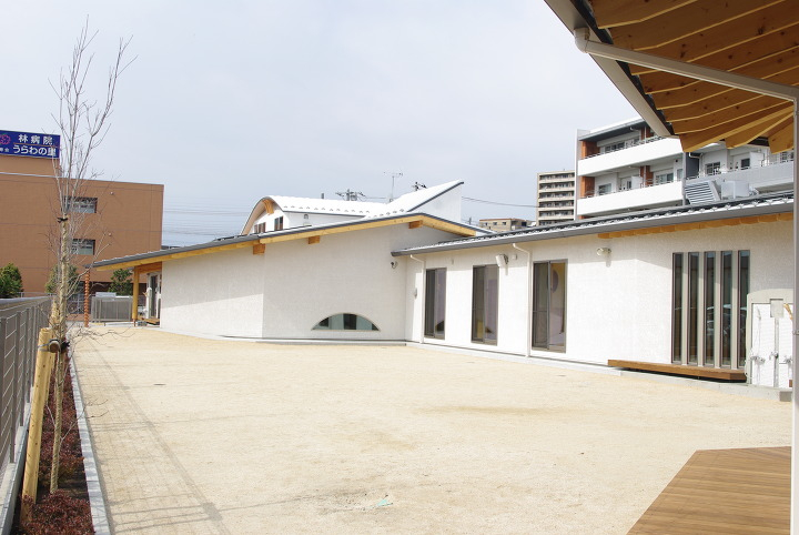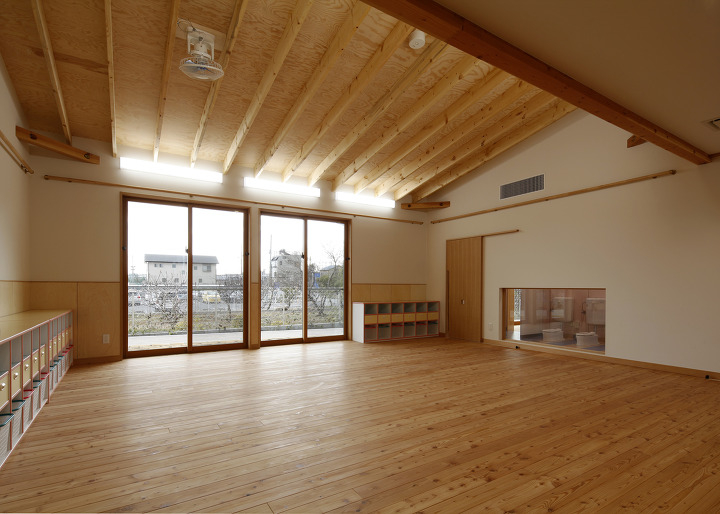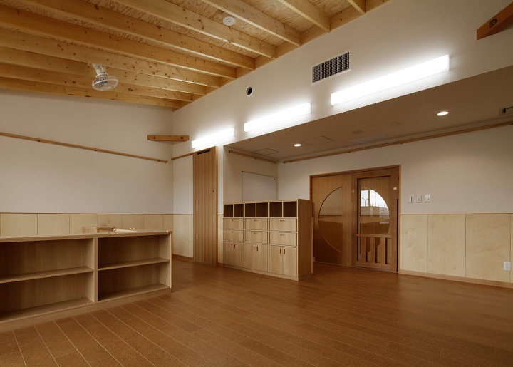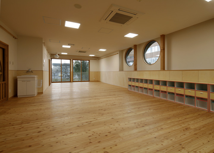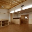 敷地は1450㎡(440坪)有り平屋でなんとか計画できる範囲でしたので園側に木造平屋を提案、意見が一致し、施設は在来木造平屋(一部二階)建てで構造材、内装材、暖房方法など自然素材いっぱいの子供たちに優しい材料を使用することが出来ました。