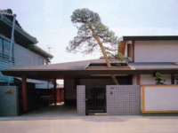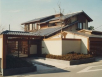 「渡辺篤史の建もの探訪」に取り上げられた建物で、80㎡(24坪)、間口3.2間で奥行きの長敷地に建つ住宅です、道路との高低差130㎝程度有った為少々高めの基礎部分を地下1階駐車場にし1階を鉄骨造、2,3階を木造とした混構造で出来ています、法事等でまとまった人が集まる機会が多いということも有り2階和室は二間続きが条件となった住居でした